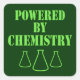 Impulsado por la química - pegatina verde oscuro con letras verdes brillantes y frascos Erlenmeyer.