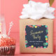Una invitación para una fiesta de verano, con letras a mano y puntos y lampionas coloridas alrededor