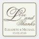 Express your gratitude with heartfelt style using this elegant Ivory Coffee Script "Love and Thanks" Square Wedding Sticker. The clean Ivory backdrop beautifully frames the large, flowing "Love and Thanks" script, rendered in the rich Coffee Romance typography. This square sticker is the perfect size for sealing thank-you card envelopes, or as a charming favor label on gift bags, boxes, or jars, featuring the couple's names and wedding date below. The combination of classic calligraphy and clean details maintains the minimalist, sophisticated aesthetic of your celebration, providing a warm and personalized final touch to your guest gifts.