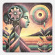Obra gráfica colorida y abstracta de una mujer adornada con flores, sol y estrellas, con un efecto acuarela y texturas.
