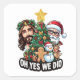 This humorous sticker features a festive group including Jesus wearing a holly wreath crown and a smiling Santa Claus in glasses. They are flanking a decorated Christmas tree, with a gingerbread man, a snowman, and a reindeer below. The bottom text reads, "OH YES WE DID". The design is set against a white background. The design may look real due to the high detail and three-dimensional texture in the artwork.