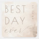 This square sticker features a minimalist and elegant design with a soft, watercolor background in shades of beige and light brown. The phrase "BEST DAY ever" is prominently displayed using a mix of clean sans-serif and bold serif fonts, complemented by an elegant cursive script for the word “ever.” The muted earth tones create a warm and inviting atmosphere, perfect for celebrating special moments. The centered layout and ample negative space enhance its modern minimalism, making it ideal for personalizing gifts or marking memorable occasions.