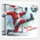 Papá Noel patea una pelota de fútbol hacia un gol, usando su icónico traje rojo y su gorra. El entorno invernal se caracteriza por la caída de copos de nieve, lo que crea un ambiente festivo. Este momento alegre capta el espíritu de los Navidades y las actividades divertidas.