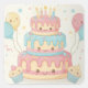 An ultra-sweet and festive design illustrated in the Japanese Kawaii style. The pattern features a smiling three-tier birthday cake with candles, surrounded by balloons, small cupcakes, and stars. The color palette is soft and pastel (pink, blue, and light blue), creating a joyful and childlike atmosphere. This design is perfect for party supplies, greeting cards, children's packaging, and any item meant for a birthday celebration
