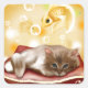Un lindo gatito descansando en un día de almohada roja soñando con peces de colores y burbujas flotando sobre su cabeza
