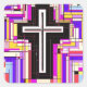 Una cruz cristiana única, brillante y moderna. Diseño gráfico llamativo con colores vivos múltiples. Vidrio muy decorativo y motivos de mosaico.