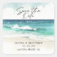 El moderno acuarela Ocean Beach Save the Date Classic Round Pegatina, con un magnífico océano turquesa con una amplia playa de arena, acentuada con escritura y tipografía moderna. La invitación perfecta para tu boda en la playa o destino.