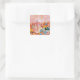 Todo es rosa y tonos cálidos desde el fondo hasta el cabello de la joven dama, cielo rosa, tulipanes rosas, peluches, etc.