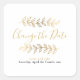 Las hojas de efecto oro y las ramas cambian la fecha Pegatina cuadrado. Cambie el sello para sobres de fecha para sus invitados e invitaciones. Este moderno guardar el pegatina de cambios característica sus nombres y fecha de boda con efecto de bonito oro deja el abordaje "cambiar la fecha" escrito en un guión elegante. Tenga en cuenta que el efecto dorado está impreso.