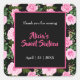 Hermosos Rosas color rosa y un brillante patrón de vegetación con un cuadrado enmarcado de color negro y rosa caliente que alberga el Gracias por la tipografía que viene, el dulce chica de los dieciséis cumpleaños, el título del evento Sweet Sixteen y la fecha del evento. Los mismos arreglos florales y el mismo patrón también aparecen en varias ideas de regalo a juego y en la decoración fiesta de la Colección Fiesta Rosa en Negro - Elegante y Moderno.