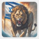 Un león encarnizado ruge sobre un telón de fondo dramático con cielos tormentosos, olas oceánicas y la bandera israelí