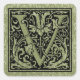 Letra decorativa encantadora V tipografía de estilo monograma inicial en forma de tipografía de primera letra en verde salvia sobre negro - revestimiento de libro verde aguacate con hojas de Ginkgo biloba blanquecinas.