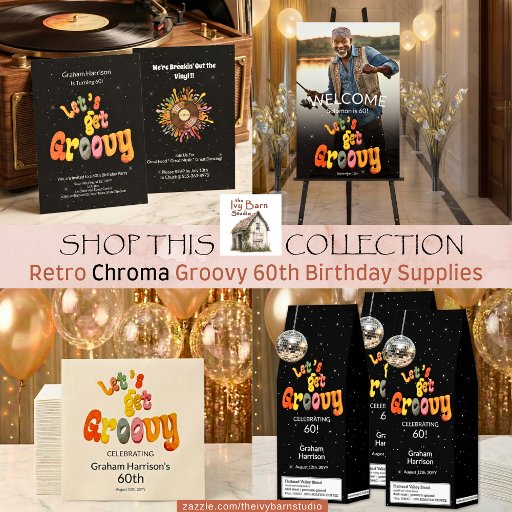 Unique Custom Created Retro Typography design saying, "Let's Get Groovy" This Sticker Set is both colorful and tasteful in Chroma Coloring and contrasting black background for your 60th Birthday Party! Fun, Elegant, and Stylish for that 70's loving man or woman turning 60! These stickers can be used for envelope seals or for favor bag labels!