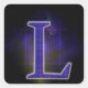 Stickers met de letter L. (bijvoorbeeld je initiaal) Leuk als je naam met de L begint of die van een ander. Achter de letter is een raster en mysterieuze wolken met een licht die erop schijnt. De letter L is gevuld met een plaid patroon en een grijze rand erom heen. kleuren blauw, paars, geel en zwart.