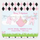 Un lindo chica de recién nacido con ropa de bebé y bebé en una línea cercana con un pájaro rosado sentado en la línea. El nombre del niño se encuentra en el centro de las grandes letras decorativas rosas, y en la parte inferior también en letras rosas se encuentran las estadísticas vitales -fecha y hora de nacimiento, peso y longitud. Un recuerdo perfecto para ese chica de recién nacido. Todo esto sobre un fondo de argyle rosa, blanco y negro (diamante).