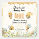 The scripted phrase “Our little honey soon to bee one” sets a joyful tone, with fully customizable serif-font party details to match your plans.