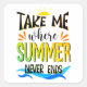 ¿Soñando con un verano interminable? ¡Pegue este diseño de "Llévame donde el verano nunca termina" donde necesite una dosis de sol! Este pegatina vibrante captura esa atmósfera despreocupada, de playa, con colores brillantes y una fuente divertida. Perfecto para portátiles, botellas de agua, portátiles y más. ¡Ponte el verano! Míralo ahora.
