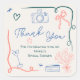 Expresa tu gratitud con nuestras pegatinas de agradecimiento para fiesta de boda en color azul francés retro, rosa, verde y beige. Este encantador diseño presenta una deliciosa variedad de elementos inspirados en el vintage, incluyendo globos, cámaras, corazones y un hermoso ramo de flores en un jarrón. Enmarcado por una caprichosa cinta ondulada, cada detalle añade calidez y personalidad a tu mensaje sincero. Con colores personalizables y una fuente manuscrita, esta tarjeta es la forma perfecta de transmitir tu agradecimiento con estilo. ¡Deja que tu aprecio brille con esta inolvidable tarjeta!