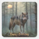 Estos pegatinas de cumpleaños presentan un guapo lobo en un mágico bosque de niebla. El texto se puede cambiar o eliminar.