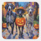 Grandes daneses adorables vestidos con juguetones disfraces de Halloween llevan baldes de calabaza mientras truco o truco bajo el cielo iluminado por la luna. Este diseño festivo resalta el marco imponente de la raza, la expresión suave y la personalidad leal, capturando a la perfección la atmósfera espeluznante y divertida de la noche de Halloween. Una gran celebración para los amantes del perro y los hinchas de Halloween por igual.