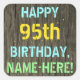 Este divertido diseño de pegatina con temática de cumpleaños incluye un mensaje como "FELIZ 95º CUMPLEAÑOS, NOMBRE - AQUÍ!", donde el nombre puede ser personalizado. El fondo está decorado con un estilo rústico, marrón y falso de aspecto de grano de madera. El texto del mensaje personalizado presenta colores como azul, amarillo y verde, y tiene un aspecto inspirado en el de las letras pintadas y estampadas. Pegatinas como estos podrían ser dados como regalo, o quizás ser usados como decoraciones en una fiesta de cumpleaños que se lleva a cabo para alguien que está celebrando su cumpleaños noventa y cinco. [~Z0000296]