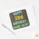 Este divertido diseño de pegatina con temática de cumpleaños incluye un mensaje como "FELIZ 33 cumpleaños, NOMBRE - AQUÍ!", donde el nombre puede ser personalizado. El fondo está decorado con un estilo rústico, marrón y falso de aspecto de grano de madera. El texto del mensaje de personalizable presenta colores como azul, amarillo y verde, y tiene un aspecto inspirado en el de las letras pintadas y estampadas. Pegatinas como estos podrían tal vez ser dados como regalo, o quizás ser usados como decoraciones en una fiesta de cumpleaños que se lleva a cabo para alguien que está celebrando su 33 cumpleaños. [~Z0000296]