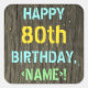Este divertido diseño de pegatinas con temática de cumpleaños incluye un mensaje como "¡FELIZ 80 cumpleaños, ()!", donde el nombre puede ser personalizado. El fondo está decorado con un estilo rústico, marrón y falso de aspecto de grano de madera. El texto del mensaje personalizado presenta colores como azul, amarillo y verde, y tiene un aspecto inspirado en el de las letras pintadas y estampadas. Pegatinas como estos podrían ser dados como regalo, o quizás ser usados como decoraciones en una fiesta de cumpleaños que se lleva a cabo para alguien que está celebrando su ochenta cumpleaños. [~Z0000296]
