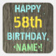 Este divertido diseño de pegatina con temática de cumpleaños incluye un mensaje como "¡FELIZ 58º CUMPLEAÑOS,<NAME>!", donde el nombre puede ser personalizado. El fondo está decorado con un estilo rústico, marrón y falso de aspecto de grano de madera. El texto del mensaje de personalizable presenta colores como azul, amarillo y verde, y tiene un aspecto inspirado en el de las letras pintadas y estampadas. Pegatinas como estos podrían ser dados como regalo, o quizás ser usados como decoraciones en una fiesta de cumpleaños que se lleva a cabo para alguien que está celebrando su cincuenta y ocho años. [~Z0000296]