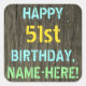 Este divertido diseño de pegatinas con temática de cumpleaños incluye un mensaje como "FELIZ 51º CUMPLEAÑOS, NOMBRE - AQUÍ!", donde el nombre puede ser personalizado. El fondo está decorado con un estilo rústico, marrón y falso de aspecto de grano de madera. El texto del mensaje personalizado presenta colores como azul, amarillo y verde, y tiene un aspecto inspirado en el de las letras pintadas y estampadas. Pegatinas como estos podrían ser dados como regalo, o quizás ser usados como decoraciones en una fiesta de cumpleaños que se lleva a cabo para alguien que está celebrando su primer cumpleaños. [~Z0000296]