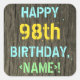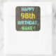Este divertido diseño de pegatina con temática de cumpleaños incluye un mensaje como "¡FELIZ 98º CUMPLEAÑOS,<NAME>!", donde el nombre puede ser personalizado. El fondo está decorado con un estilo rústico, marrón y falso de aspecto de grano de madera. El texto del mensaje de personalizable presenta colores como azul, amarillo y verde, y tiene un aspecto inspirado en el de las letras pintadas y estampadas. Pegatinas como estos podrían ser dados como regalo, o quizás ser usados como decoraciones en una fiesta de cumpleaños que se lleva a cabo para alguien que está celebrando su cumpleaños noventa y ocho. [~Z0000296]