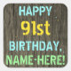 Este divertido diseño de pegatina con temática de cumpleaños incluye un mensaje como "FELIZ 91º CUMPLEAÑOS, NOMBRE - AQUÍ!", donde el nombre puede ser personalizado. El fondo está decorado con un estilo rústico, marrón y falso de aspecto de grano de madera. El texto del mensaje personalizado presenta colores como azul, amarillo y verde, y tiene un aspecto inspirado en el de las letras pintadas y estampadas. Pegatinas como estos podrían ser dados como regalo, o quizás ser usados como decoraciones en una fiesta de cumpleaños que se lleva a cabo para alguien que está celebrando su cumpleaños noventa. [~Z0000296]