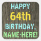 Este divertido diseño de pegatina con temática de cumpleaños incluye un mensaje como "FELIZ CUMPLEAÑOS 64, NOMBRE - AQUÍ!", donde el nombre puede ser personalizado. El fondo está decorado con un estilo rústico, marrón y falso de aspecto de grano de madera. El texto del mensaje personalizado presenta colores como azul, amarillo y verde, y tiene un aspecto inspirado en el de las letras pintadas y estampadas. Pegatinas como estos podrían tal vez ser dados como regalo, o quizás ser usados como decoraciones en una fiesta de cumpleaños que se lleva a cabo para alguien que está celebrando su sexagésimo cuarto cumpleaños. [~Z0000296]