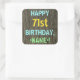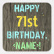 Este divertido diseño de pegatinas con temática de cumpleaños incluye un mensaje como "¡FELIZ CUMPLEAÑOS 71,<NAME>!", donde el nombre puede ser personalizado. El fondo está decorado con un estilo rústico, marrón y falso de aspecto de grano de madera. El texto del mensaje de personalizable presenta colores como azul, amarillo y verde, y tiene un aspecto inspirado en el de las letras pintadas y estampadas. Pegatinas como estos podrían tal vez ser dados como regalo, o quizás ser usados como decoraciones en una fiesta de cumpleaños que se lleva a cabo para alguien que está celebrando su cumpleaños setenta y uno. [~Z0000296]