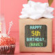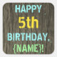 Este divertido diseño de pegatinas con temática de cumpleaños incluye un mensaje como "FELIZ 5° cumpleaños, {NAME}!", donde el nombre se puede personalizar. El fondo está decorado con un estilo rústico, marrón y falso de aspecto de grano de madera. El texto del mensaje personalizado presenta colores como azul, amarillo y verde, y tiene un aspecto inspirado en el de las letras pintadas y estampadas. Pegatinas como estos podrían tal vez ser dados como regalo, o quizás ser usados como decoraciones en una fiesta de cumpleaños que se lleva a cabo para alguien que está celebrando su quinto cumpleaños. [~Z0000296]