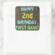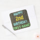 Este divertido diseño de pegatinas con temática de cumpleaños incluye un mensaje como "¡FELIZ SEGUNDO CUMPLEAÑOS, NOMBRE PRIMERO!", donde el nombre puede ser personalizado. El fondo está decorado con un estilo rústico, marrón y falso de aspecto de grano de madera. El texto del mensaje personalizado presenta colores como azul, amarillo y verde, y tiene un aspecto inspirado en el de las letras pintadas y estampadas. Pegatinas como estos podrían tal vez ser dados como regalo, o quizás ser usados como decoraciones en una fiesta de cumpleaños que se lleva a cabo para alguien que está celebrando su segundo cumpleaños. [~Z0000296]