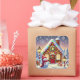 A whimsical and festive gingerbread house illustration, decorated with candy canes, glowing Christmas lights, and a snowy rooftop. A cheerful snowman stands nearby with a glowing lantern, surrounded by softly falling snowflakes. This heartwarming design captures the magic of the holiday season, perfect for you.