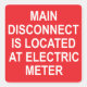 A red sticker with the words "MAIN DISCONNECT IS LOCATED AT ELECTRIC METER" in white letters. Good for electricians to satisfy labeling requirements.