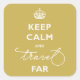 Pegatina Cuadrada Mantén la Calma y Viaja Lejos Letra a Mano Dorado