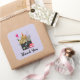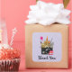 Un pegatina de agradecimiento con un ilustracion gráfico con monumentos europeos como la torre inclinada de Pisa, el Big Ben, la Torre Eiffel etc... Un globo de aire caliente en el cielo y un bus de dos pisos, con una gran cámara. Un sello con las pirámides egipcias pegadas a la cámara.
