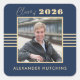 Esta pegatina de graduación elegante de la clase de 2026 presenta rayas doradas, marco de foto y texto sobre un fondo azul marino.