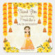 Marigold garlands la linda chica india Haldi personalizado de nombre personalizado favorece a los pegatinas. Marigolas amarillas y naranjas con campanas, fondo de mandala amarilla.