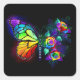 Arcoiris, mariposa monarca luminosa, pintada de forma artística con ramo de iridiscente, rosas brillantes y luminiscentes sobre fondo negro. Mariposa arcoiris.