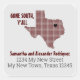 Háganles saber a dónde vas con esta elegante invitación en movimiento. Presenta el estado de Texas en un patrón de cuadrícula con un corazón que puede mover para mostrar dónde está su nueva casa. Perfecto para cualquier correspondencia que envíe después de su traslado para asegurarse de que todos conocen su nueva dirección. Viene en naranja quemado, marrón, rojo, azul de la bandera estatal, verde, morado, naranja, negro y amarillo - la mayoría basado en los colores de las escuelas estatales. Productos a juego disponibles.