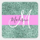 Moda y purpurina de color rosa y verde brillante deslumbra el nombre del monograma blanco y el pegatina cuadrado inicial. Su nombre personalizado y su monograma están escritos en un guión elegante con letras a mano con un fondo rosado. Puede cambiar el color del texto y el estilo y el tamaño del tipo de letra mediante la opción personalizar.