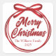 Moda, escritura cursiva moderna a través de una bella cinta roja y arco dice MERRY NAVIDAD en elegante tipografía cursiva. Una reverencia atada está muy de moda para los pegatinas de vacaciones no fotográficas de 2025. Personalice con su familia o nombre de negocio en el centro
