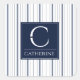 Moda diseño marinero blanco y azul marino con rayas y tu nombre y inicial dentro del marco cuadrado de la marina oscura. Estilo de verano fresco y adorable.