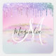 Pegatina cuadrado Girly y glam con goteo de purpurinas sombríos en el arco iris de unicornio, pincel de pincel de unicornio de arcoiris iridiscente y fondo rosa de color rosa. Su nombre personalizado y su monograma están escritos en un guión elegante con letras a mano. Puede cambiar el color del texto y el estilo y el tamaño del tipo de letra mediante la opción personalizar.