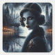 Una mujer elegante con un peinado de lujo y un abrigo forrado de pieles, mirando a un paisaje urbano iluminado por la noche