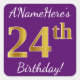Este sencillo diseño pegatina de cumpleaños muestra un mensaje como "¡El cumpleaños número 24 de ANameHere!", mientras que el "24th" tiene un aspecto de color falso/imitación de inspiración dorada, sobre un fondo morado. El nombre se puede personalizar. Pegatinas como estos podrían ser tal vez un regalo para alguien que esté celebrando su vigésimo cuarto cumpleaños, o tal vez podrían ser usados como decoraciones en una fiesta de cumpleaños. [~Z0000246]