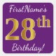 Este sencillo diseño de pegatina de cumpleaños incluye un mensaje como "¡Cumpleaños 28 de FirstName!", con el "28″ que tiene un aspecto de color falso/imitación de oro, en un fondo morado. El nombre se puede personalizar. Pegatinas como estos podrían ser tal vez un regalo para alguien que esté celebrando su 28 cumpleaños, o tal vez podrían ser usados como decoraciones en una fiesta de cumpleaños. [~Z0000246]